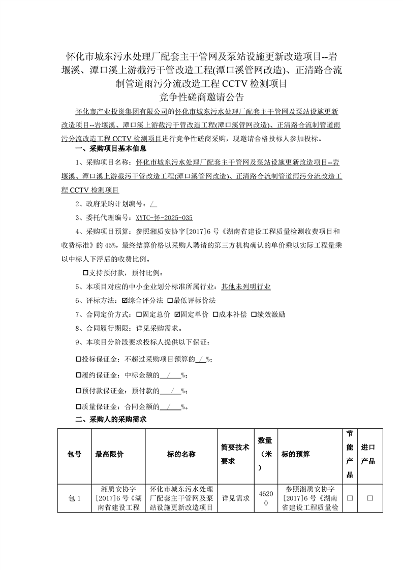 禁漫 的怀化市城东污水处理厂配套主干管网及泵站设施更新改造项目--岩堰溪、潭口溪上游截污干管改造工程(潭口溪管网改造)、正清路合流制管道雨污分流改造工程CCTV检测项目竞争性磋商邀请公告