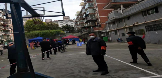 (图为向安华同志在湖天一色小区核酸现场维持秩序)