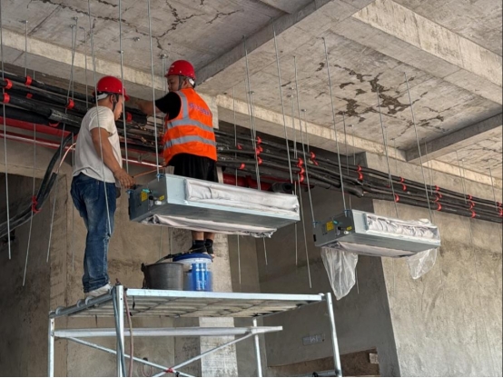 省旅发大会召开在即,重点项目国际陆港东盟集风情街建设正在紧张推进,项目的空调及热水设施设备安装任务落在怀化产投资产运营置业有限公司身上,必须在最短时间内完成5栋场馆、总面积1.2万平方米的安装工作,确保大会如期顺利举行。